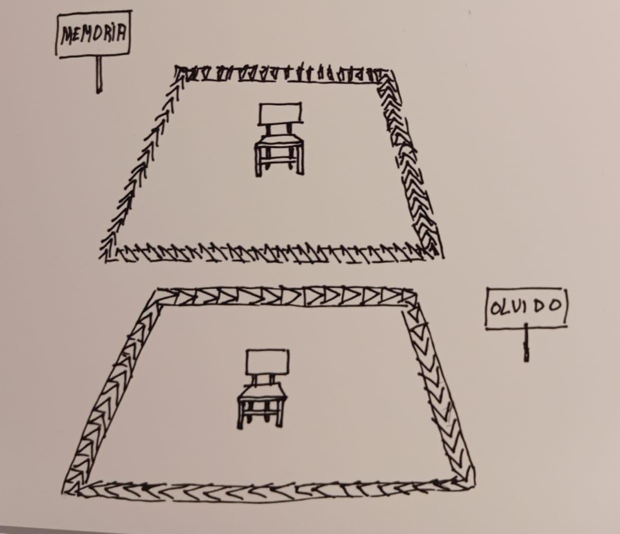 En una performance de 1991, Esther Ferrer dispuso en el suelo muchos sobres con la solapa levantada. A su lado, podía leerse un cartel con la palabra MEMORIA. La acción consistía en marchar sobre los sobres abiertos y dejarlos todos, absolutamente todos, cerrados. Llegado ese momento, la artista le daba la vuelta al cartel: en el reverso aparecía la palabra OLVIDO.